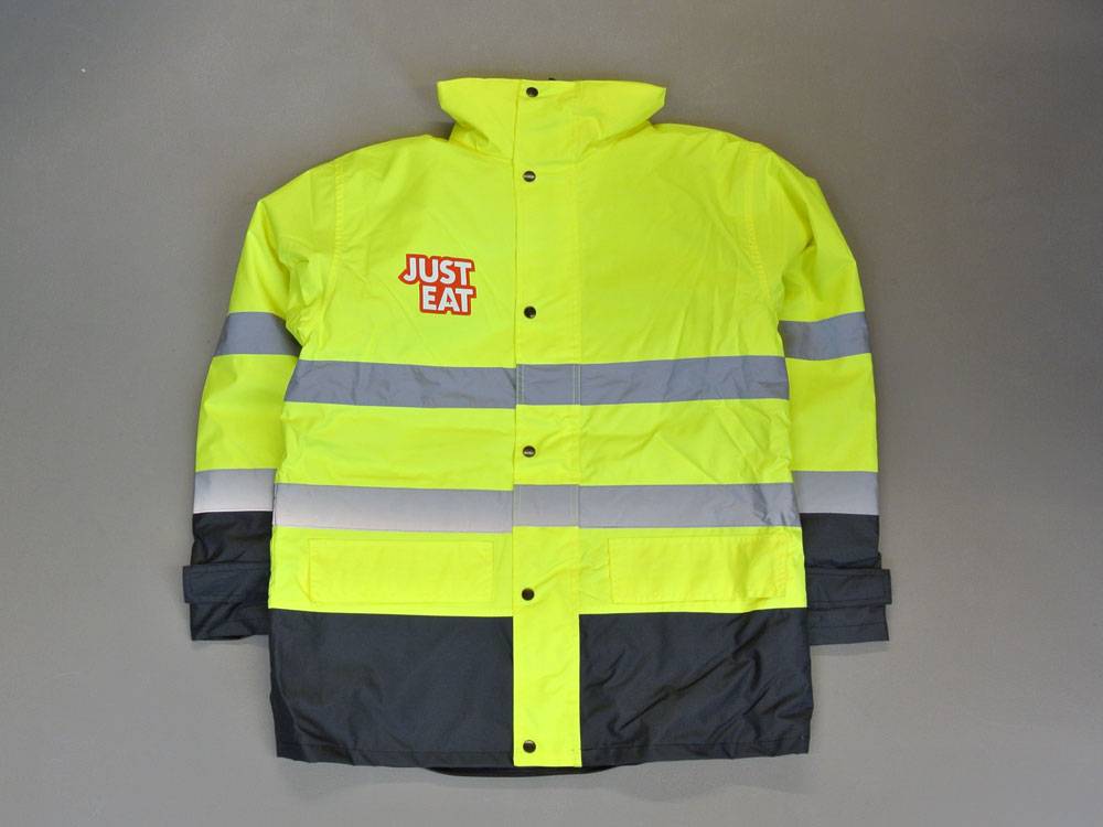 Bezorgjassen kopen doet u gemakkelijk in onze JUSTEAT shop. Onze bezorgjassen zijn zeer goed zichtbaar in het verkeer, dankzij de fluoriscerende gele kleur en reflecterende strepen op de mouwen en voor- en achterkant. De bezorgjassen zijn gemaakt van 100% polyester en hebben een solide ritssluiting om de jas mee af te sluiten. Bovendien staat het JUSTEAT-logo op de achterkant van de bezorgjas en dat maakt van uw bezorger ook nog eens een rijdend reclamebord!