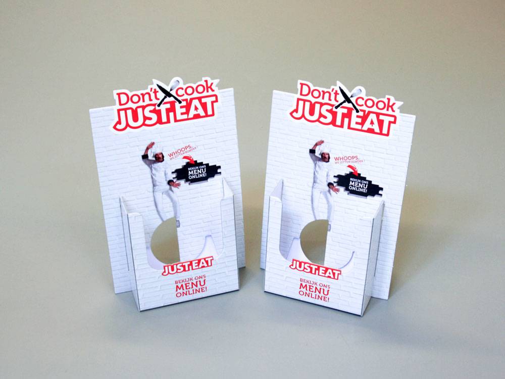 Bestel de JUST EAT menukaarthouder en maak eens en voor altijd een einde aan die rommelige toonbank! De menukaarthouder is geschikt voor gevouwen A4- en A5-folders en gemaakt van stevig karton, zodat u uw menukaarten goed kunt presenteren. De menukaarthouder is gemakkelijk zelf in elkaar te zetten en is gratis en voor niets exclusief bij JUST EAT te bestellen.